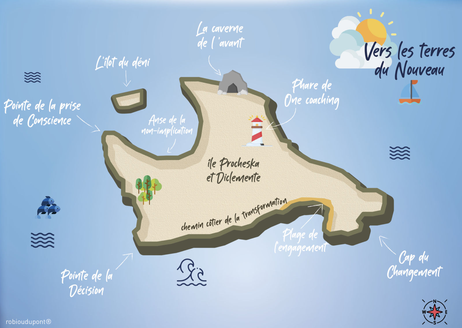 • L’auteur a également intégré les apports du Clean langage (Grove), de l’intervention stratégique (Nardone) et de l’approche centrée sur la solution (de Shazer) pour construire un questionnement structuré tenant lieu de fil d'ariane, qui permet de trouver rapidement l'issue